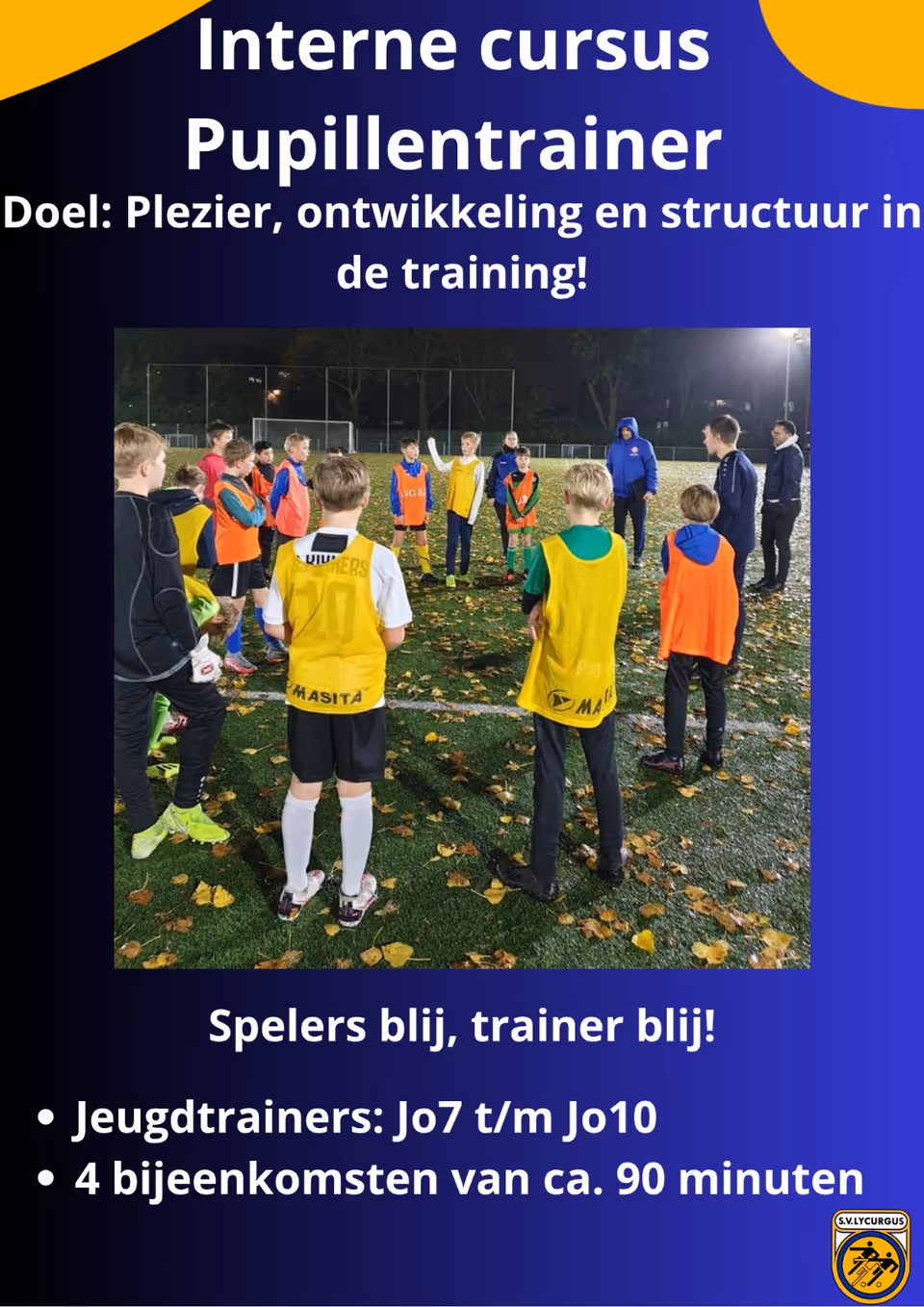 De cursus geeft je inzicht in de werkwijze van onze vereniging, handige oefenvormen en vooral veel plezier op het veld. Samen zorgen we voor een positieve, leerzame en veilige omgeving voor alle pupillen. Doe mee en ontdek hoe leuk het is om als trainer, coach en/of leider actief betrokken te zijn bij het voetbal! De cursus start medio januari 2026 en wordt georganiseerd in het clubhuis en op de velden van Lycurgus.